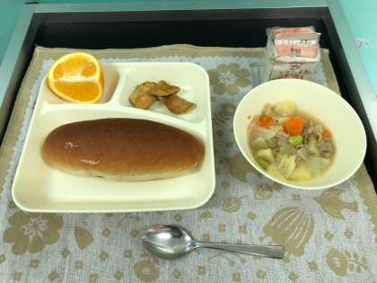 今日の献立は、鶏肉のカレー風味焼き、洋風煮、はっさく、黒糖パン、牛乳です。いただきます。