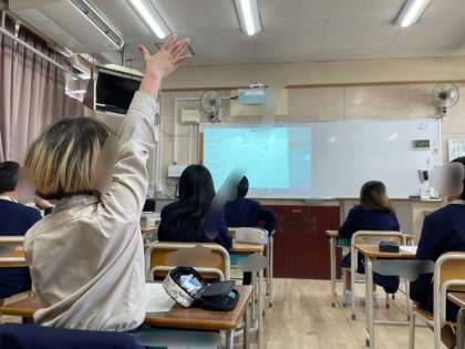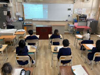 算数の学習で、「1000をこえる数」のテストの答え合わせをしています。プロジェクターで答えを投影しながら確認しています。答え合わせをする事で理解が深まっています。