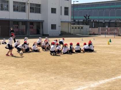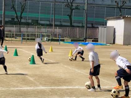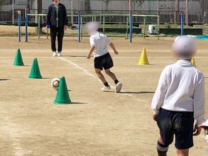 体育のボール運動あそびの学習です。ドリブルでコーンを回ってきます。なかなかうまくいかない子も頑張っていました。