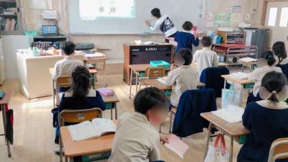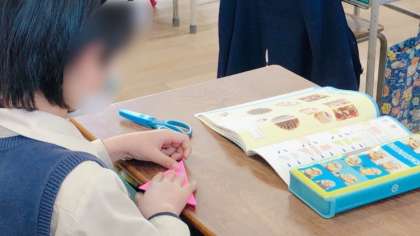 算数の学習です。色紙を使って、二分の一の図形を作っていました。色紙で作った図形を半分に切ることで、視覚的に二分の一の概念を理解しようとしていました。