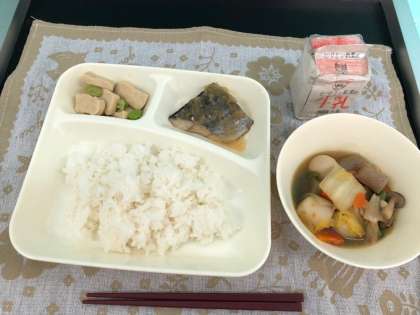 今日の献立は、さごしのおろし醤油かけ、里芋と野菜の含め煮、高野豆腐の煮物、ご飯、牛乳です。いただきます。