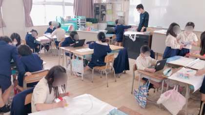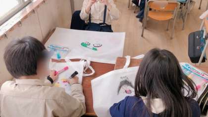 図工の時間に描いた絵画作品を入れる作品袋のデザインをしていました。もうできている子もいて、その子たちはタブレット端末でドリル等の学習をしていました。