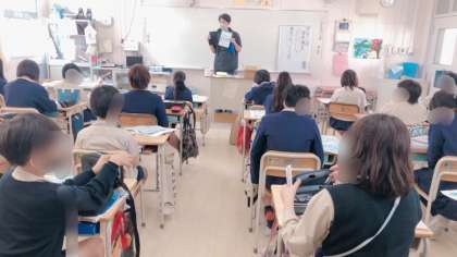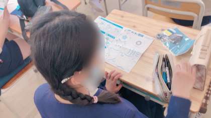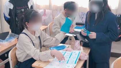 家庭科の学習で、裁縫実習の小物作りに取り組みます。フェルト布や刺繍糸などを使ってマスコットやペンケース、ティッシュケースなどを作ります。今日は計画を練る時間のようです。