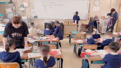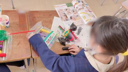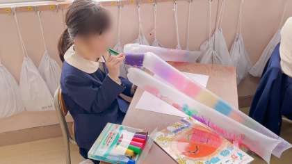 図工の学習です。「にょきにょきとびだせ」という題名で、紙コップやビニル袋などを使って吹き戻しをつくっています。楽しいデザインの吹き戻しが出来ています。早速、吹いて遊んでいました。