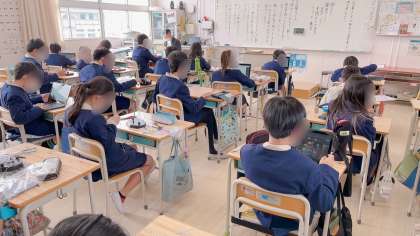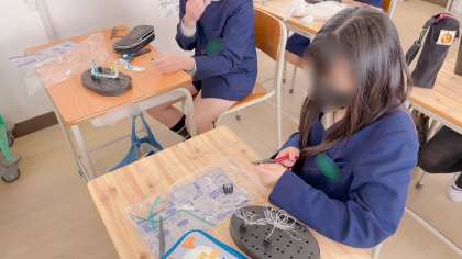 図工の学習です。針金を使っての立体作品です。針金を伸ばしたりまげたりコイル状にしたりして立体を形作っていきます。なかなか細かい作業ですね。