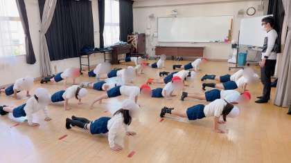 運動場がぬかるんで使えず、体育館も卒業式練習で使えないので多目的室で体育をしていました。腕立て伏せを頑張っていました。