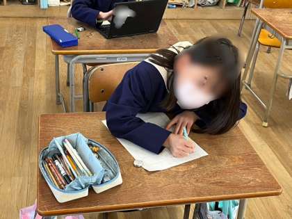 キャリアパスポートの取り組みで、この一年を振り返ってのプリントを書いていました。できたら、先生と見直し、パスポートファイルに綴じておきます。