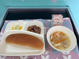 今日の献立は、豚肉のデミグラスソース、スープ、カリフラワーとコーンのサラダ、コッペパン、バター、牛乳です。いただきます。