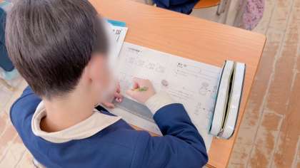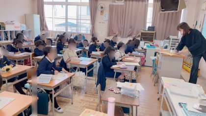 算数の学習です。まとめのプリントに取り組んでいました。掛け算の筆算のところです。正確な計算はもちろんのこと、数字を丁寧に書くことや単位の数字を綺麗に揃えることなどにも気をつけて書いていました。