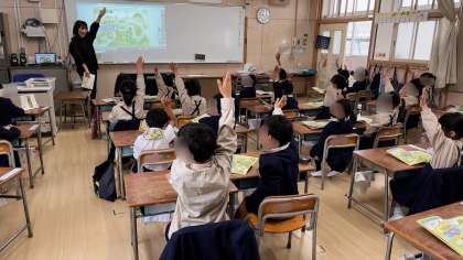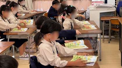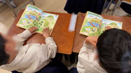 教科書を使った学習が始まりました。算数の教科書の巻頭に載っている絵をみて質問に答えていました。元気よく挙手する子がたくさんいました。