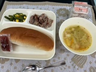 今日の献立は、豚肉のガーリック焼き、スープ、三度豆とコーンのサラダ、コッペパン、イチゴジャム、牛乳でした。ごちそうさまでした。