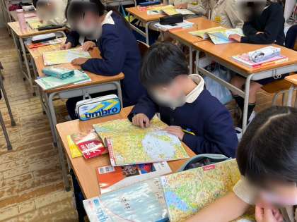 社会科の学習です。地図帳で大阪府の市町村を調べていました。「市はいくつあるかな?」という問いかけに、一所懸命探していました。