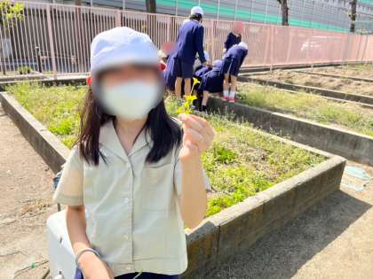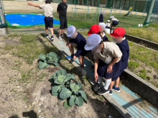 理科の学習で、春の自然探しをしに学習園付近に来ていました。キャベツについている虫や小さな花などを見つけていました。