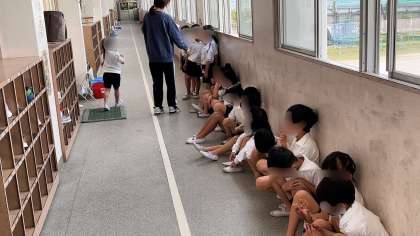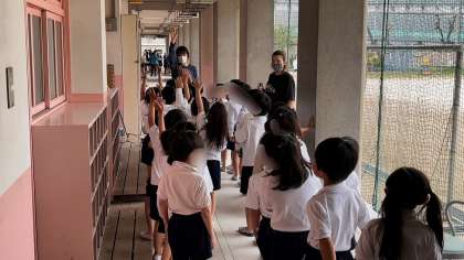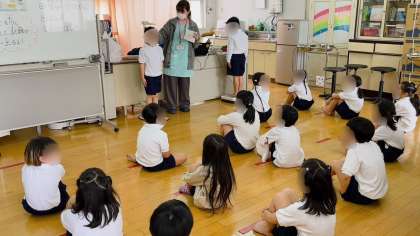 初めての発育測定にいきました。名前の順番に並んで行くことや靴のしまい方なども確かめながら行きました。保健室の中では静かに順番を待っていました。
