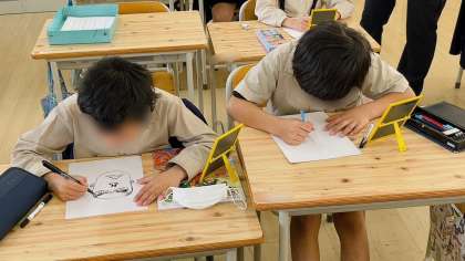 図工の学習です。自分の顔を描いていました。鏡を見ながら口や目などパーツから描いていきました。