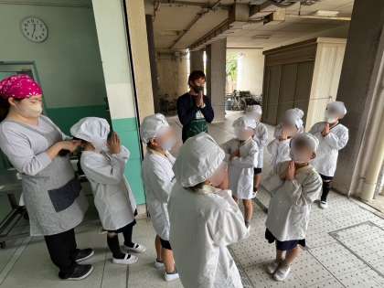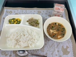 今日の献立は、麻婆豆腐、きゅうりとコーンの甘酢和え、もやしとピーマンの胡麻炒め、ご飯、牛乳です。おいしそうですね、いただきます。