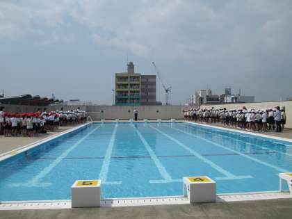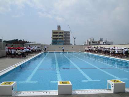 津波が来た想定でプールサイドに二次避難しました。