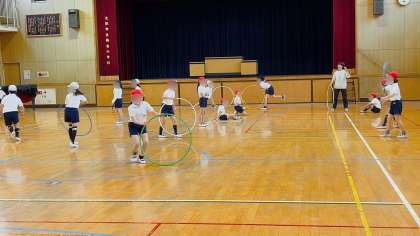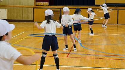体育の学習で、体育用輪を使った運動をしていました。相手に向かって転がしてパスし合ったり、フラフープみたいに回したり身体を上手に使って楽しんでいました。