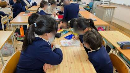 図工の学習です。学級の係活動のポスターを作成していました。係の中で意見を出し合いながら作っていました。とても楽しそうでした。