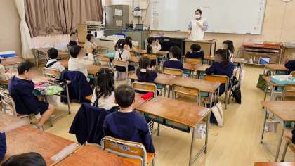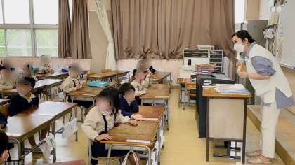 英語活動の様子です。講師の先生からの発問はほとんど英語ですが、子どもたちも知っている英語や習った英語などで返答していました。会話のキャッチボールが楽しそうでした。