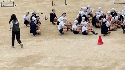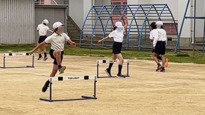 体育で陸上運動のハードル走の学習に入りました。先生の説明を聞いて、ハードル間の歩数を確かめる練習をしていました。
