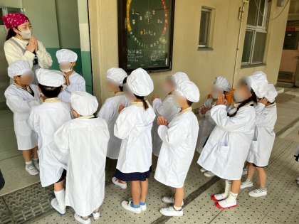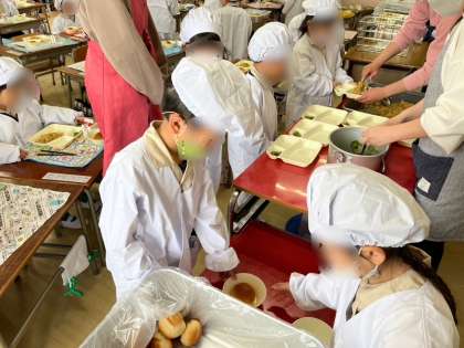 1年生も自分たちで給食を取りに行き、自分たちで配膳します。とても上手に配膳できていました。
