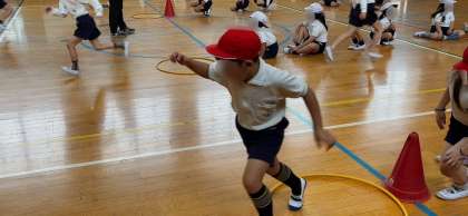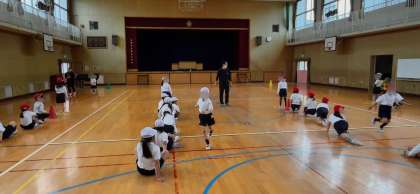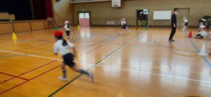 体育の学習です。リレーあそび運動です。楽しそうな歓声の中元気に走っていました。