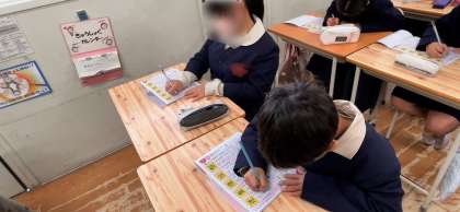 国語の漢字練習です。白板に書き順の動画が流れるので、それに合わせて手を動かして練習します。その後、漢字ドリルに実際に書いて練習します。