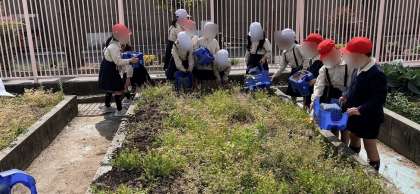 生活科で育てていたチューリップの鉢植えを片付けて次の植物を植えられるようにしていました。