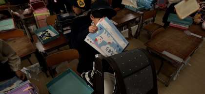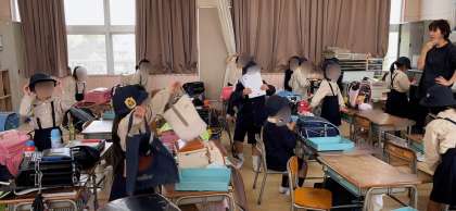1年生は、5時限目の半分を帰る用意に費やしています。特に金曜日は、体操服やエプロン、上靴など持って帰るものが多いので大変です。時間がかかっても全部自分でするよう頑張っています。