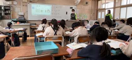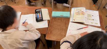 算数で、大きい数の足し算の学習をしていました。先生の説明をしっかり聞きながら板書を写していました。