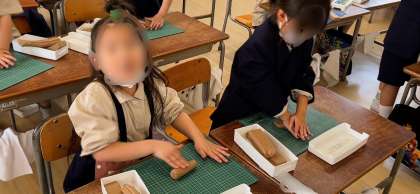生活科の学習で油粘土工作をしました。使い始めでまだ硬い粘土を柔らかくする為、粘土板に置いて体重をかけてこねたり、両手でこねて細長い紐を作ったり楽しそうでした。子どもたちは粘土工作が大好きですね。
