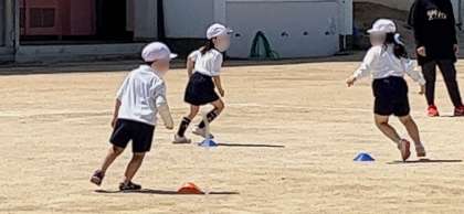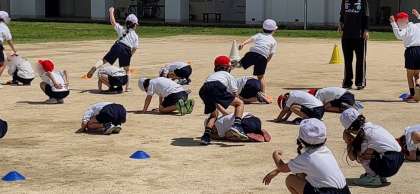 体育の学習です。グループ対抗で、馬跳び競争をしたりコーンを回りながら走るリレーをしたりして楽しんでいました。