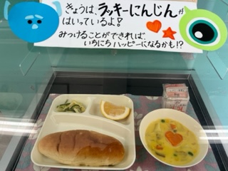 今日の献立は、コーンクリームシチュー、キャベツときゅうりのサラダ、河内晩柑、おさつパン、牛乳です。いただきます。