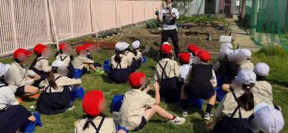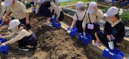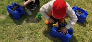 生活科の学習でミニトマトを育てます。一人ひとりが鉢を用意して苗を植えました。元気に育つようやさしくお世話していきます。