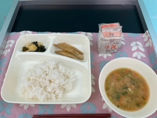 今日の献立は、きびなごの天ぷら、豚汁、若竹煮、ご飯、牛乳です。いただきます。
