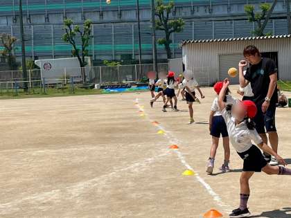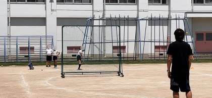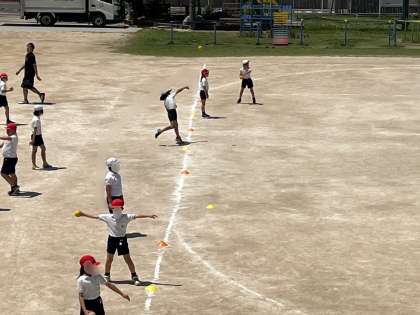 体育の学習で、スポーツテストのソフトボール投げの練習をしていました。最初は軽いボールで長い距離を投げる練習をして、その後、順番で高く投げる練習(ネットの上を越える軌道で投げる)をしていました。