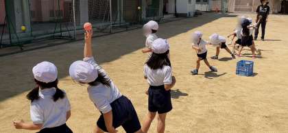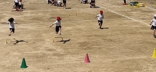 体育の学習です。ミニハードルをまたぎ越しながらコーン目掛けて走っていました。その後、スポーツテストに向けてボール投げの練習をしました。校舎壁に向かって何回も練習しました。