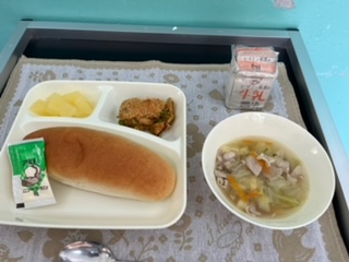 今日の献立は、カレードリア、豚肉とキャベツのスープ、りんご(カット缶)、コッペパン、ソフトマーガリン、牛乳です。いただきます。