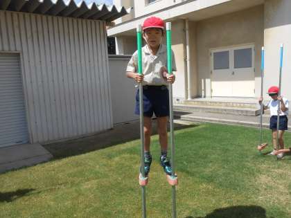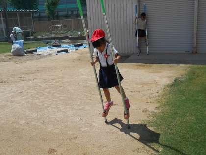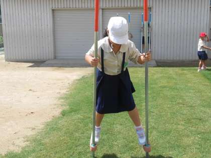 久しぶりに運動場で遊ぶことができ、竹馬を使いました。