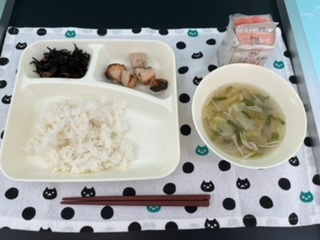 今日の献立は、鮭の胡麻味噌焼き、五目汁、ひじきの炒め煮、ご飯、牛乳です。いただきます。