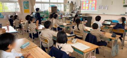 3年生の様子です。英語のビデオ教材を見て学習しています。