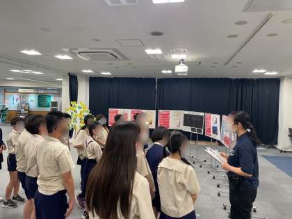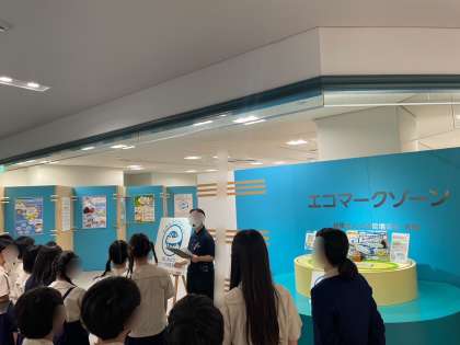 エコプラザに着きました。係の方から、SDG'Sやエコマークなどについての展示の説明を聞きながら見学しています。
