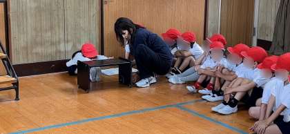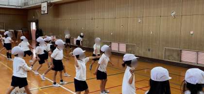 体育の学習です。紅組と白組に分かれて、紅組はスポーツテストの長座体前屈(柔軟性を測定する種目)、白組はソフトボール投げの練習をしていました。ソフトボール投げの練習は、新聞紙を丸めて作ったボールを壁に貼ったアニメキャラクターめがけて投げていました。