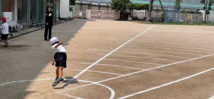 1年生もソフトボール投げの記録をとっていました。投げる人が「いきまーす」と声をかけ、ボール拾いの係の人が「はーい」と返事をしてから投げていました。みんなで安全をしっかり確認しながら進めていました。