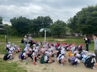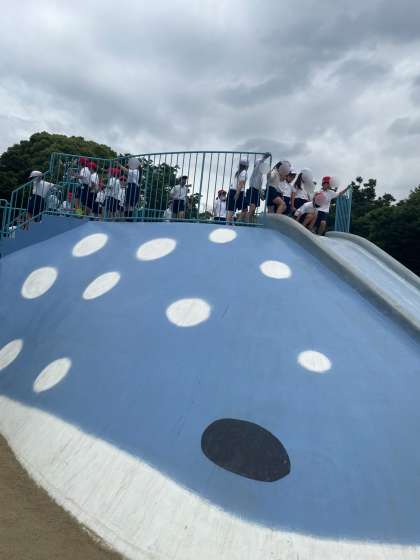 目的地の八幡屋公園につきました。天気はどんよりですが、子どもたちは楽しそうに遊んでいます。