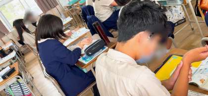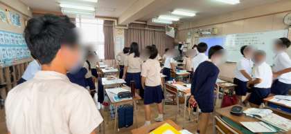 理科の学習です。ヒトの体の単元で、循環器系の働きの学習です。安静時の脈拍数と足踏みを100回した後の脈拍数とを比較しています。