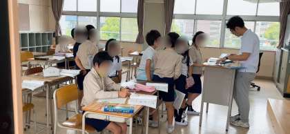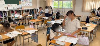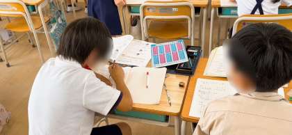 算数の大きな数の計算の学習です。練習問題に取り組んでいました。答え合わせをしてもらったら、まだ、頑張っている友だちを支援しに行ってました。
