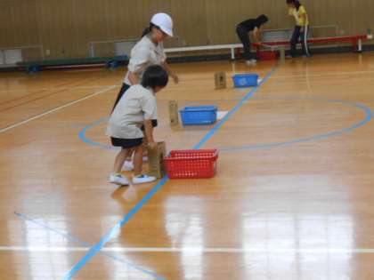 今日の児童集会では、運動会の特別競技の練習をしました。