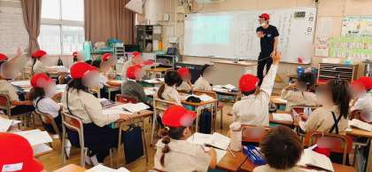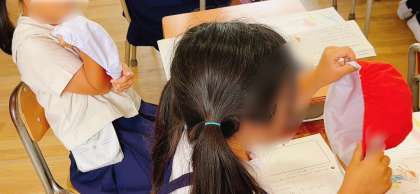 物語文の学習です。ワークシートを使って読み解いていきますが、情景を想像するために紅白帽子を被ったり(物語は主人公が赤い帽子を手にするところから始まります)、公園へ向かうように足踏みしたりと実際に動作化していました。